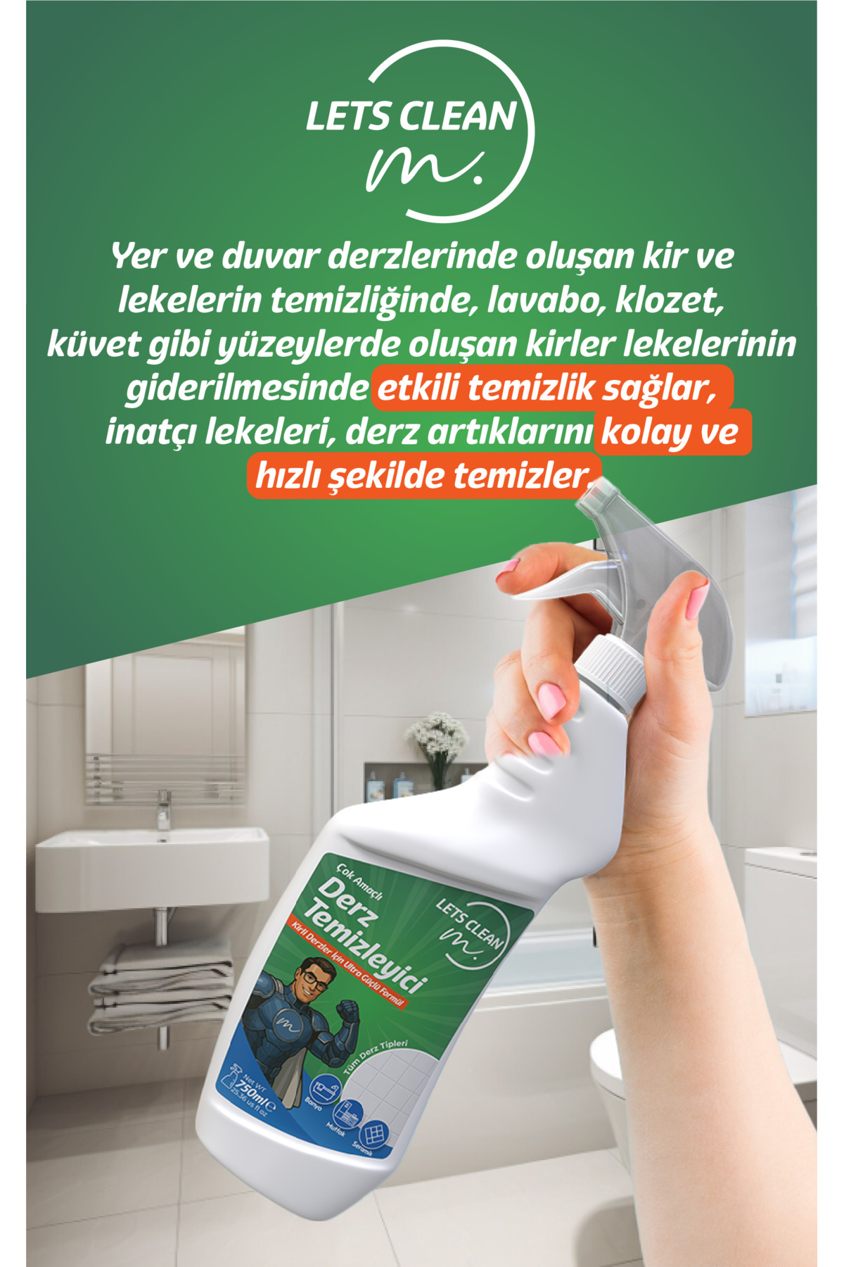 Kireç ve sabun artıklarını anında söküp atan, banyonuzda hijyenik parlaklık sağlayan güçlü formül.