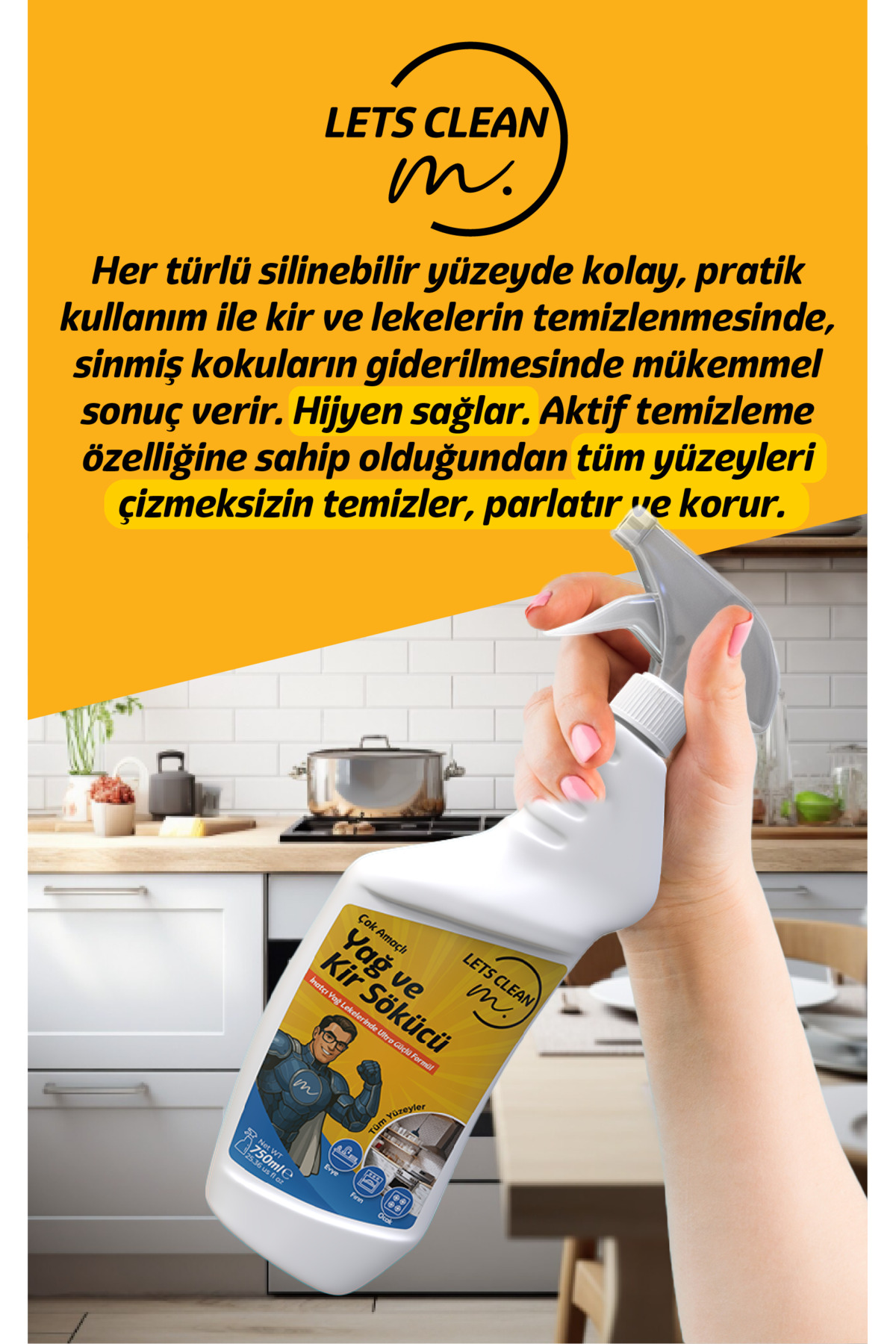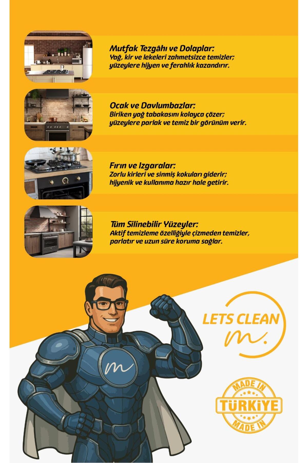 Mutfak ve sanayi alanlarındaki inatçı yanmış yağları ve kirleri ovalamadan söker atar.